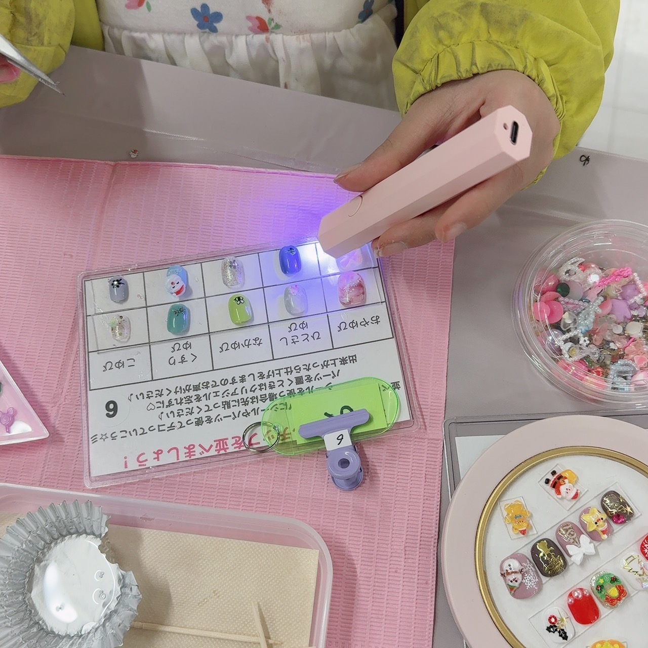 仕上げにはライトで硬化させるジェルを使用し、本格的なネイルチップ作りを体験できます。